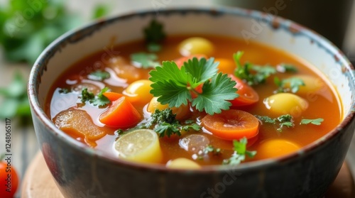 A close-up of a steaming bowl of detox soup filled with vibrant vegetables and herbs, garnished with fresh parsley, emphasizing its nourishing and cleansing properties.