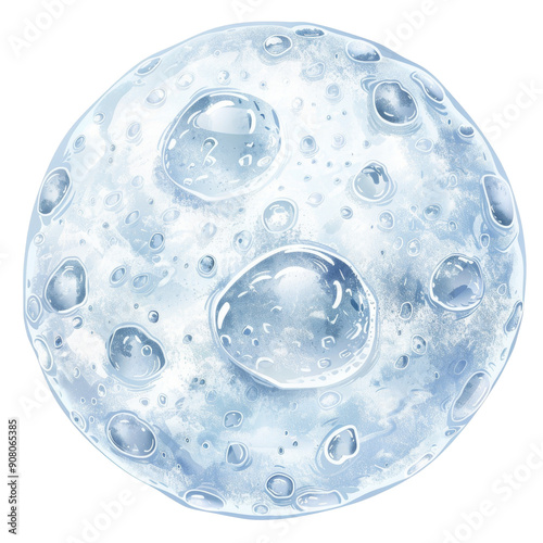 A close-up of a stylized moon with large water droplets on its surface. The moon is white and blue with a circular shape.