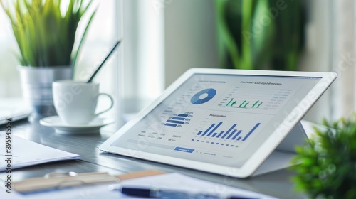 A close-up of a tablet displaying a social media marketing report, placed on a modern desk.