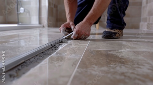 close, technician, use, ensure, new, tile, lay, evenly, level, precise, bathroom, measure, design, craft, trade, ruler, concrete, shower, space, skill, detail, working man, labor, install