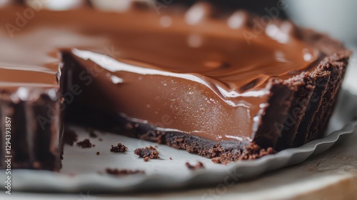 A close-up of a thick chocolate tart cake with a crumbly crust and smooth ganache filling.
