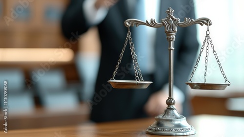 A close-up of a traditional balance scale symbolizing justice, with a blurred figure in the background, representing law or legal proceedings.