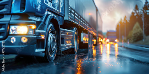 A close-up of a truck driving on a wet road during rain, highlighting the challenges of transportation in adverse weather.
