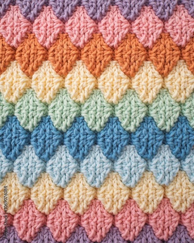 A close-up of a vibrant knitted fabric with diamond shapes in pink, blue, orange, and purple, showcasing a detailed, textured design.
