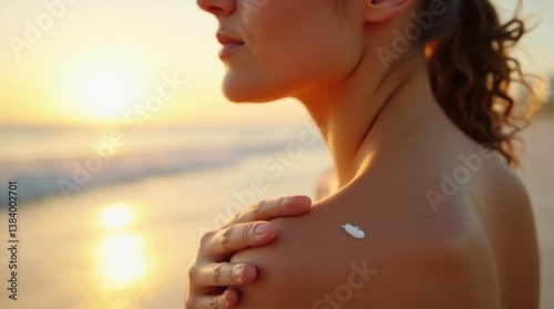 A close-up of a young woman applying sunscreen on her shoulder at the beach, with golden sunlight reflecting on her skin, promoting skincare and sun protection.