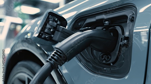 A close-up of an electric vehicle charging connector plugged into a vehicle, showcasing modern automotive technology.