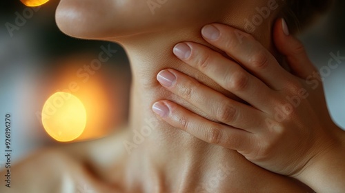 A close-up of an elegant hand gently touching the neck, creating a sense of beauty and intimacy in a soft, warm setting.