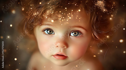 A close-up of an enchanting baby girl with curly hair and captivating eyes, surrounded by sparkles.