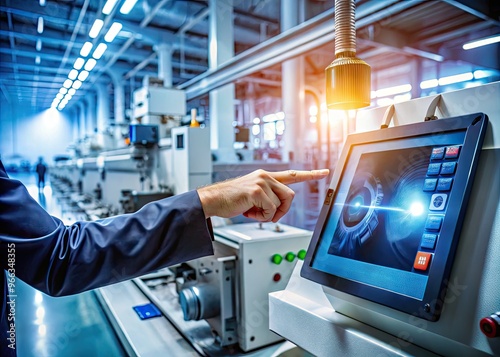 A close-up of an index finger pressing a digital icon on a futuristic touchscreen display in a modern industrial manufacturing facility with machinery in the background.
