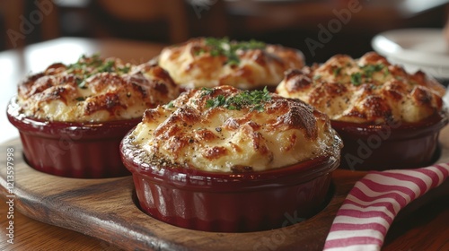 A close-up of baked dishes with a golden crust, garnished with herbs on a wooden platter.