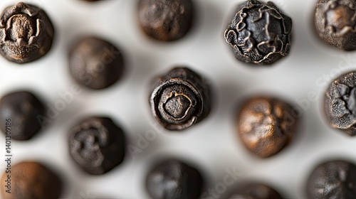 A close-up of black peppercorns isolated on a white background. These peppercorns are a popular spice used in cooking around the world. They are known ...