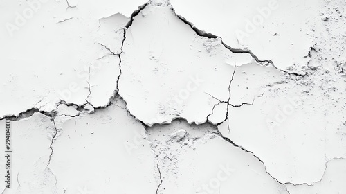 A close-up of cracked white paint on a wall, showcasing the unique texture and patterns created by wear and age.
