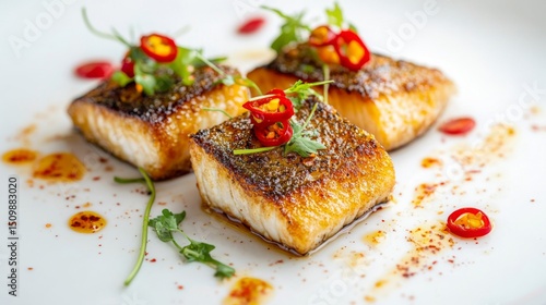 A close-up of crispy fried seabass glazed with fish sauce, garnished with thinly sliced fresh herbs and chilies, presented on a clean, white plate with vibrant colors
