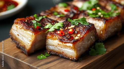A close-up of crispy pork belly pieces arranged on a wooden board, garnished with fresh herbs and chili, emphasizing the dish's rich textures and flavors.