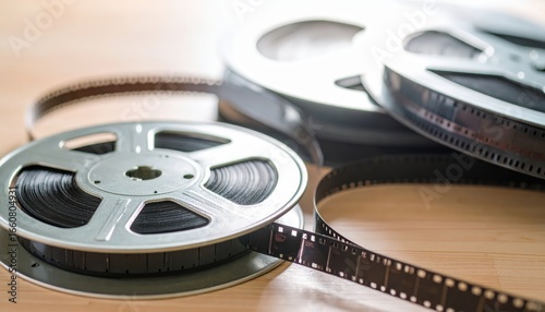 A close-up of film reels showcasing traditional movie film, highlighting the texture and detail of vintage filmmaking equipment.