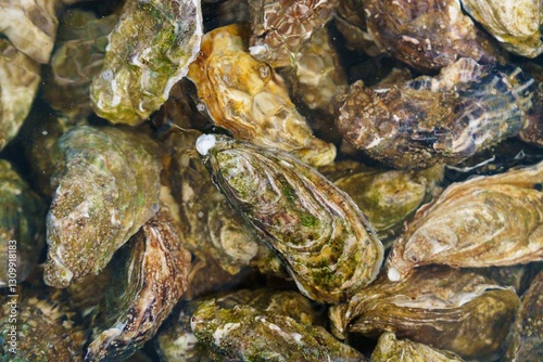 A close-up of fresh oysters on a wet wooden table. The oysters have shades of brown and gray with a rough texture, piled haphazardly, showcasing their natural beauty and freshness.