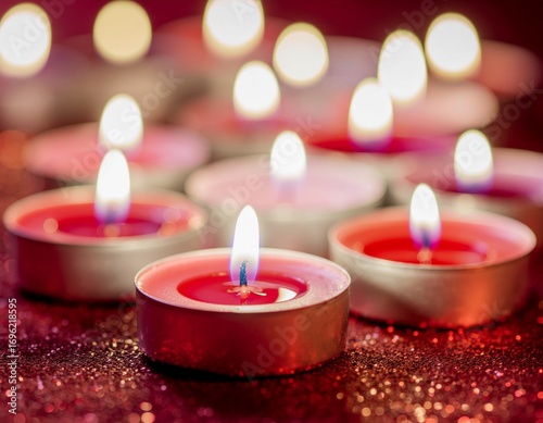 A close-up of glowing red and pink tea light candles burning on a sparkling glitter surface with a soft focus background.