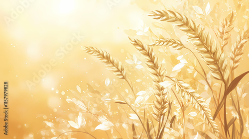 A close-up of golden wheat ears is set against a backdrop of a golden field bathed in soft sunlight. Auriferous. Illustration