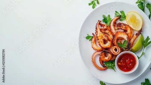 A close-up of grilled squid with seafood dipping sauce on a white ceramic plate, leaving ample space for creative text and branding.