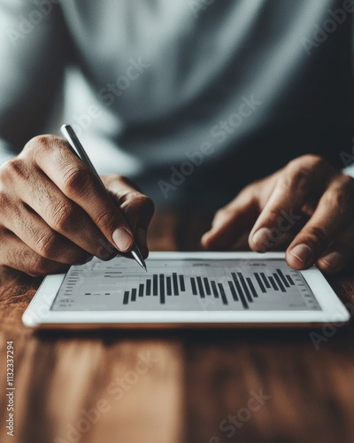A close-up of hands using a tablet to analyze financial data and trends on a wooden desk.