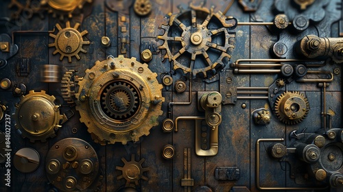 A close-up of intricate, metallic gears and machinery, creating a steampunk-inspired design.