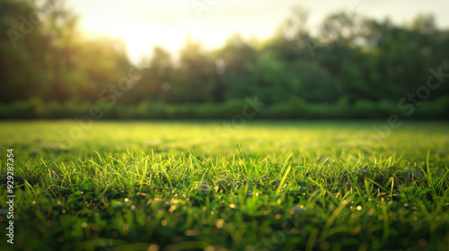 A close-up of lush green grass, blurred trees, and a blue sky, evoking a sense of peace and tranquility. The perfect backdrop for your nature-inspired projects.