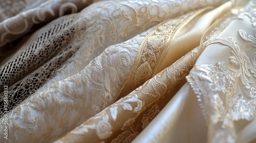 A close-up of luxurious fabric textures, including velvet, silk, and lace, arranged in soft folds