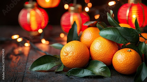A close-up of oranges with green leaves, positioned near traditional Chinese lanterns on a festive backdrop.