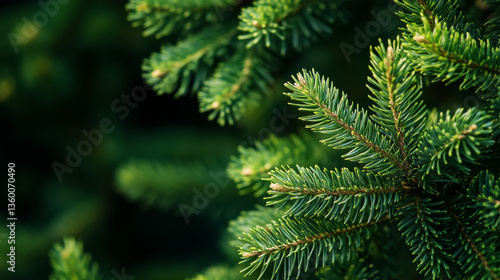 A close-up of pine tree branches in a forest, highlighting their rich green color and intricate needle structures
