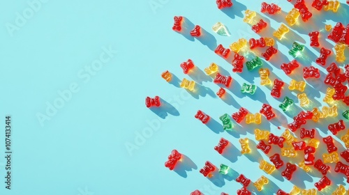 A close-up of red, yellow, and green gummy bears scattered on an aqua blue background, adding a cheerful, lively atmosphere