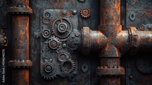 A close-up of rusty pipes and gears, showcasing an industrial, steampunk aesthetic with intricate details.
