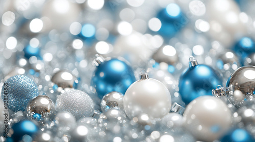 A close-up of shimmering blue and white ornaments capturing the essence of holiday spirit