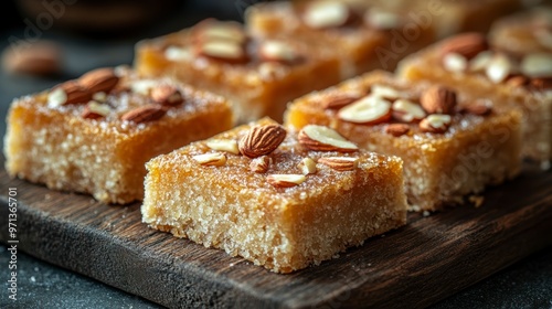 dessert, sweet, food, nut, almond, sugar, treat, snack, cookery, confection, delicious, epicure, hand-made, traditional, receipe, cooking, favor, texture, indulgence, presentation, plate, wooden, board, square, sugarcane, honey, caramel, artisanal, festive, celebration, sharing, homemade, organic, ingredient, culinary, tasty, appetising, rich, crispy, chewy, soft, gold, garnish, serving, delicacy, enjoyment, flavouring, sweetness