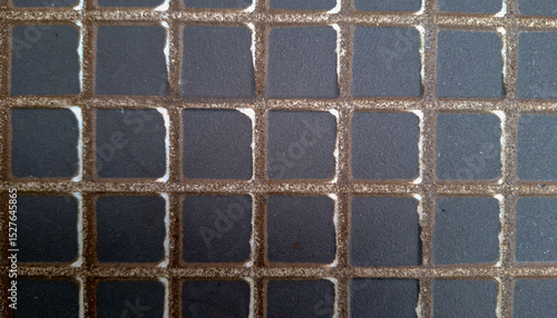 A close-up of the dark square tile grid, featuring raised, textured, and slightly damaged grout lines that create a unique rustic feel.