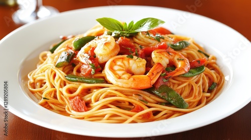 A close-up of udon stir-fried with colorful vegetables, shrimp, and a drizzle of soy sauce, showcasing the vibrant colors and textures of this delicious dish.