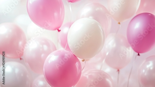 A close-up of white and pink balloons floating against a soft pastel background, creating a cheerful and festive atmosphere for a happy birthday celebration.