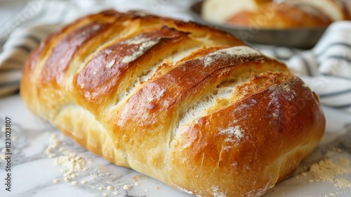 A close-up photo of a freshly baked loaf of bread, with a golden crust and soft, fluffy interior.