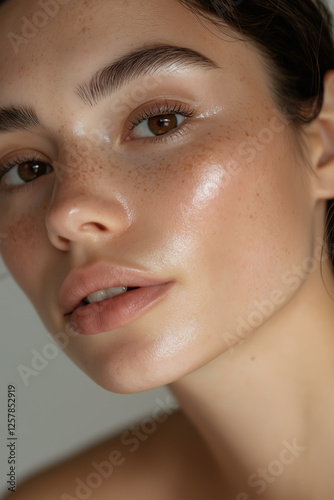 A close-up photograph of a beautiful woman with no makeup, brown eyes, and freckles against a light background. Her slightly glowing skin highlights natural beauty and texture, capturing a fresh and r
