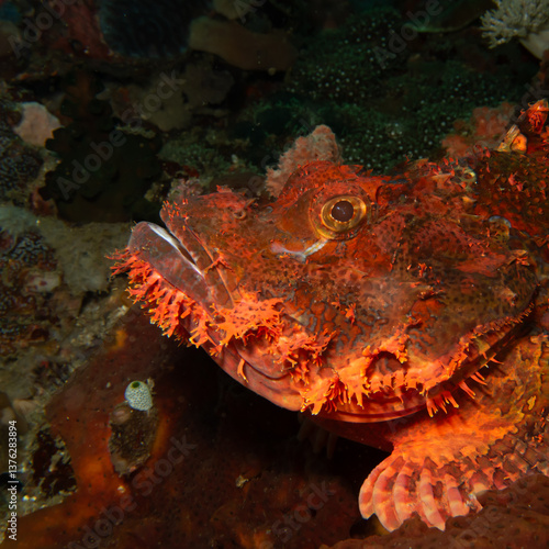 species, fish, ocean, reef, aqualung, sea, underwater, wildlife, colourful, tropical, aquatic, environment, natural, nature, ocean life, dangerous, diving, macro, red, scorpio, closeup, eye, fin, ocean floor, venom, aquarium, atlantic, beautiful, camouflage, camouflaged, cave, colours, poison, poisonous, scorpionfish, sting, stone, venomous, water, wild