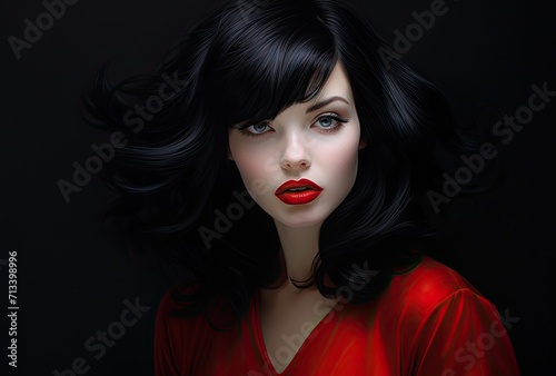 A close-up portrait highlighting a woman adorned with red lipstick on her lips, accentuating the beauty of women and cosmetics.