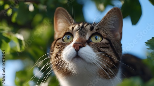 cat, felino, nature, portrait, pet, animal, leaf, eye, whisker, fur, cute, curious, domestic, exploring, green, foliage, predator, mammal, carnivore, vertebrate, wildlife, environment, sharpened, closeup, looking, alert, watchful, crafty, playful