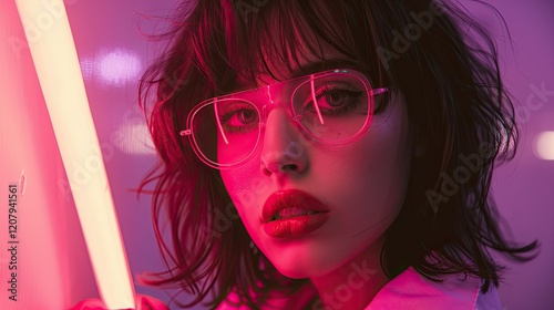 A close-up portrait of a person with glasses, illuminated by vibrant pink and purple lighting.
