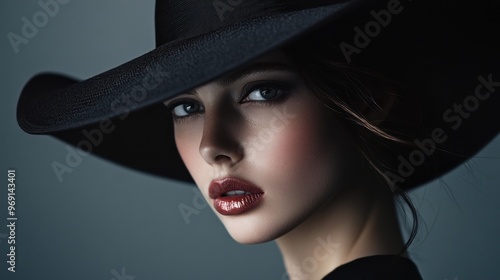 A close-up portrait of a woman wearing a large black hat, showcasing elegance and beauty.