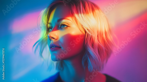 A close-up portrait of a woman with rainbow light reflecting on her face, surrounded by colorful, dreamy bokeh lights. .