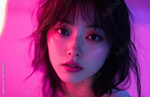 A close-up portrait of a young Asian woman in neon lights combines modern elegance with bold aesthetics, perfect for use in creative branding, fashion, or cinematic campaigns.