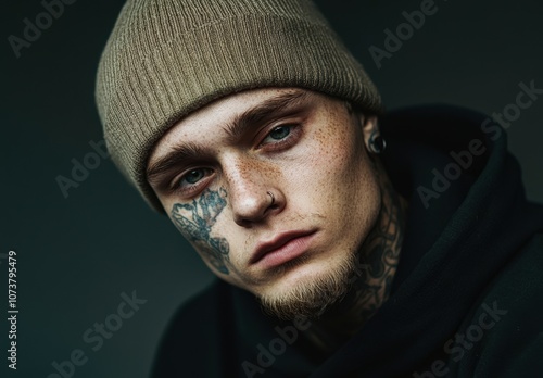 portrait, tattoo, beanie, fashion, style, youth, emotion, individuality, expression, male, closeup, trendy, lifestyle, modern, art, culture, design, confidence, identity, cool, character, portraiture, urban, casual attire, creative, attitude, people, diversity, relaxation, natural, unique, vibe, feeling, gaze, aesthetic, contemporary, artistry, photogenic, emotion, personal, edgy, editorial, social, photo, close, inspiration, model, expressive