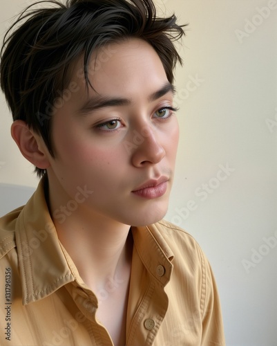 portrait, youth, expression, style, fashion, individuality, warmth, simplicity, serene, trend, mood, inspiration, confidence, skin, photo, gaze, personality, emotion, contemporary, creativity, sophisticated, eye, model, elegance, colours, artistic, calm, charme, allure, essence, attention, uniqueness, clothing, charming, closeup, hair, attraction, light, charisma, art, lifestyle, detail, aesthetic, beauty, casual attire, natural