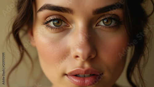portrait, woman, beauty, closeup, face, natural, eye, green eye, skin, flawless, make-up, soft light, expression, femininity, elegance, model, photo, photo, fashion, lip, eyebrow, eyelash, smooth skin, glow, radiant, young, alluring, aesthetic, glamour, charme, serene, soft focus, detail, warm tones, head shot, artistic, realism, captivating, smiling, eye, closeup, teeth, brunette, lady, mouth, hair, smile