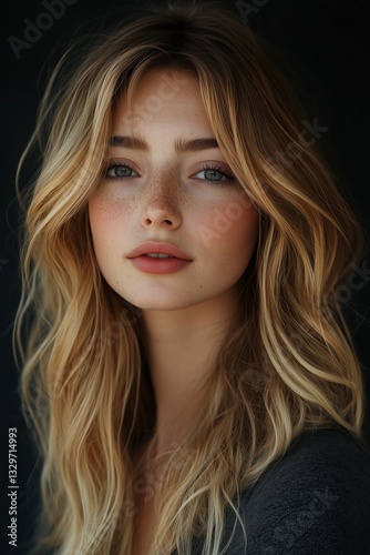 A close-up portrait of a young woman with long, wavy blonde hair and natural makeup. She has a soft expression, with freckles on her cheeks and bright blue eyes, set against a dark background.