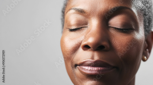 A close-up portrait of an African American woman with short curly hair, closed eyes, and a slight smile, expressing calmness and happiness, against a neutral gray background